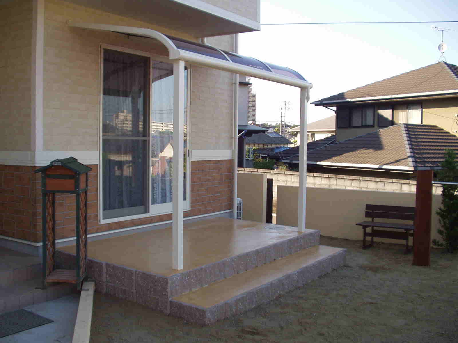 白いテラスをつけました。石貼りが可愛いかなと思ったのですが予算が合わず思案???。
