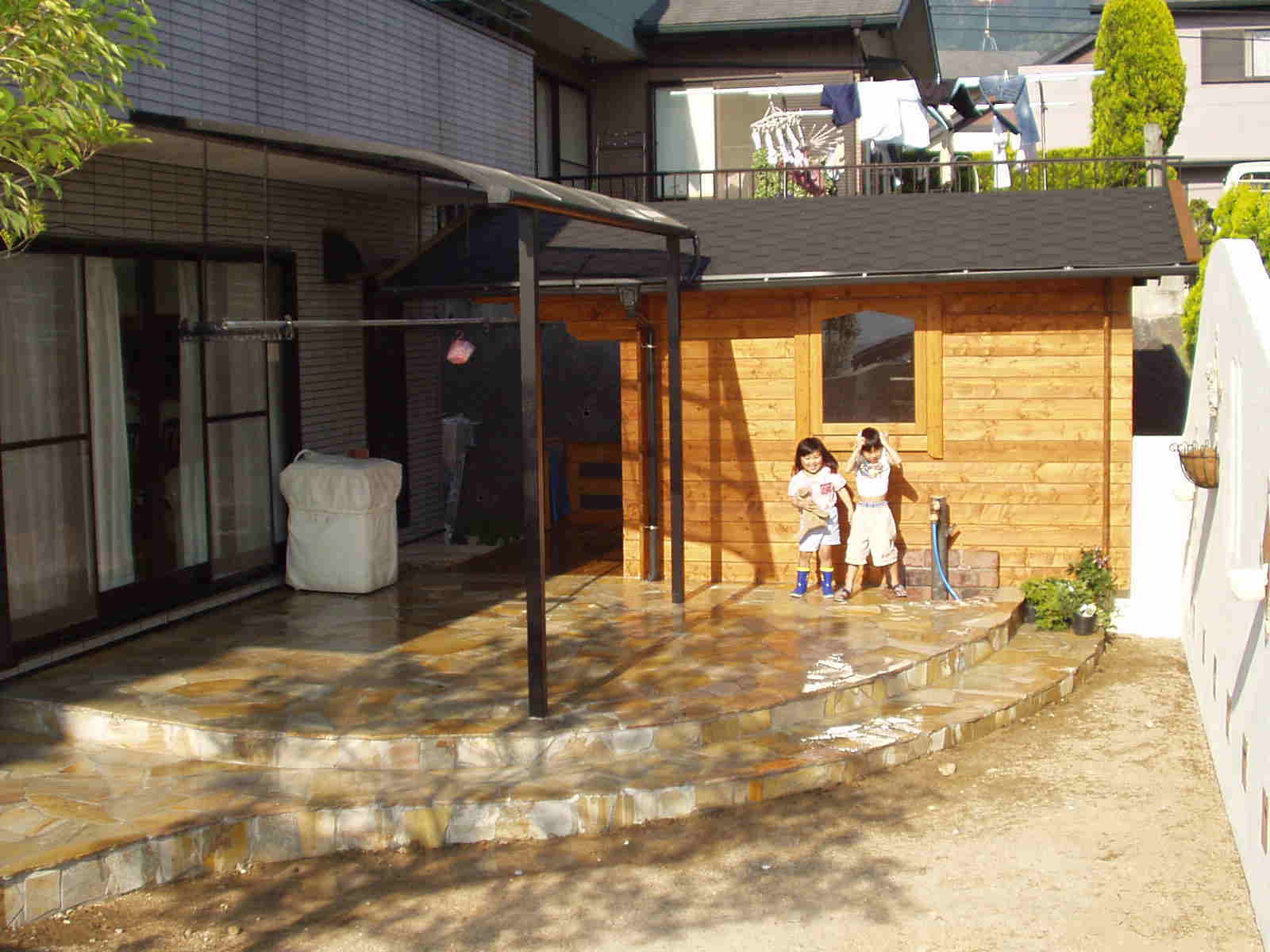 ログハウスの屋根の上に少しかかるようにテラスをつけました。こうすることで雨の日でも自由に行き来が出来ます。