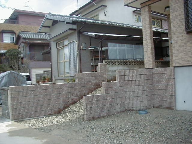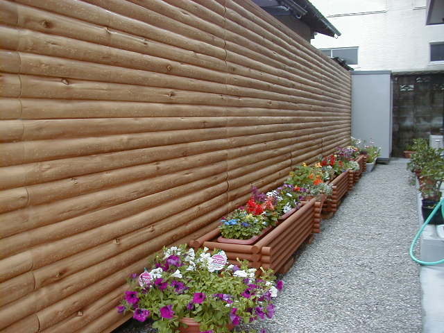 ここで目新しいものはユニット門柱(東洋エクステリアのクリフストーン1型) 隣との境界に(タカショーのこだわりログ)があります。クリフストーン1型は従来のタイル張りとは違い、乾式工法のためセメントのアクなどが出ずに綺麗です。