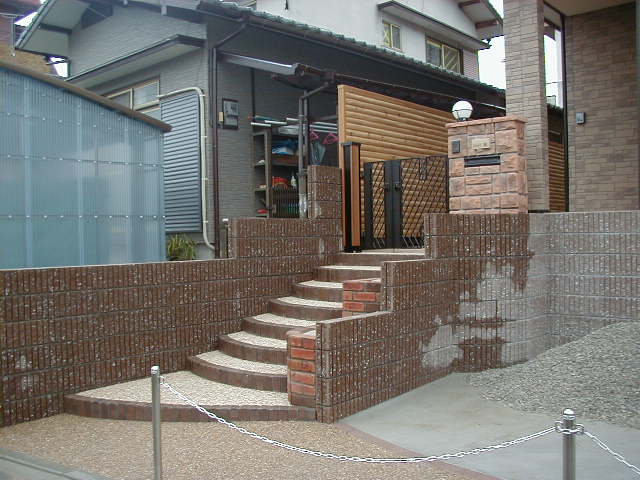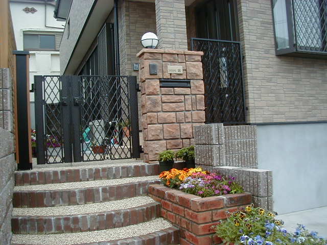要望として、レンガを使用した階段まわり・ユニットの門柱・樹脂製のログ目隠しフェンスが欲しいとの事でした。その他細かいところはある程度お任せ戴き、設計いたしました。