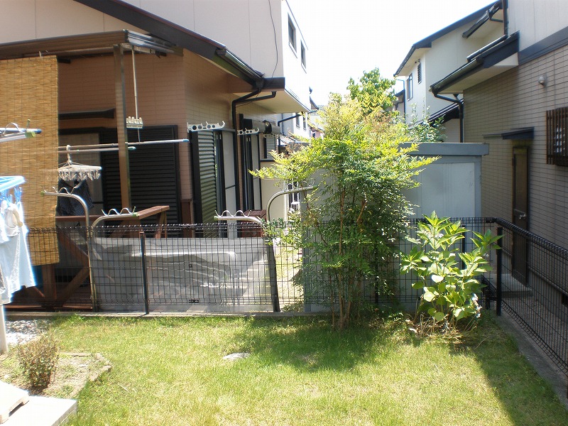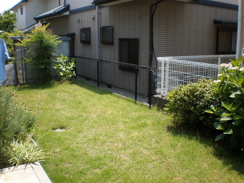 以前工事をさせていただいたお客様の紹介で庭の相談を受けました。 芝が敷いてあるのですが湿気が多く、夏場の蚊も気になりなかなか庭に出ないということでした。 隣地の浴室の窓も気になるところ。